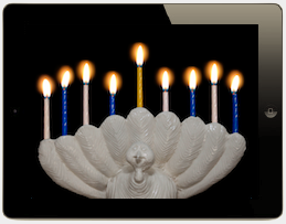 The menorah that has taken the world by storm now has an app! Commemorating the rare overlap of Thanksgiving and Hanukkah, the Menurkey was conceived and designed by 10-year-old New York resident Asher Weintraub. After an incredible Kickstarter campaign & a Wall Street Journal cover, Menurkey has teamed up with the creators of iMenorah to bring you iMenurkey. Celebrate this epic mash-up holiday in style :) |